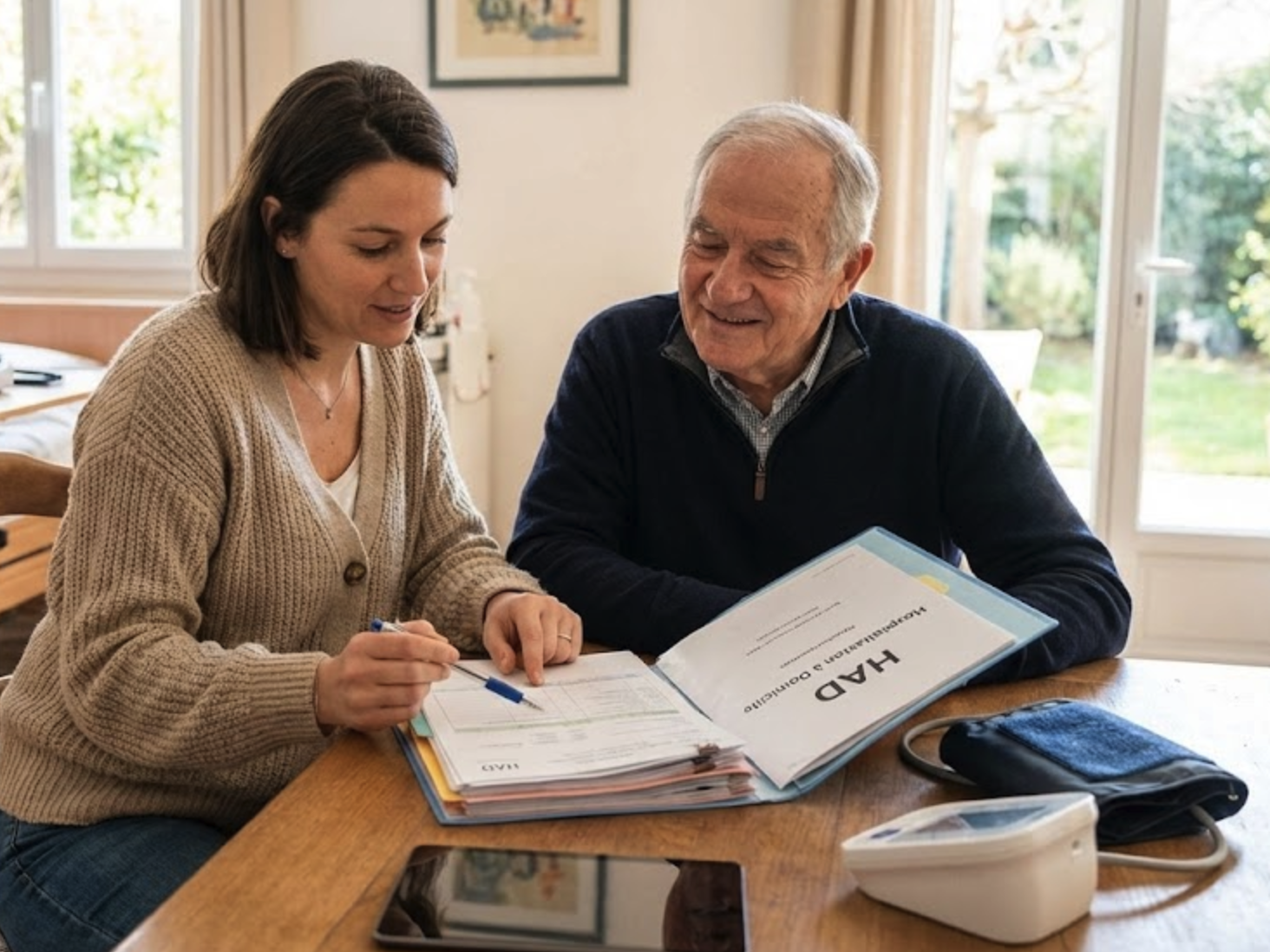 L’HAD est un établissement de santé (comme l’hôpital) mais sans les murs. Elle fournit le matériel lourd (lit médicalisé, oxygène, médicaments hospitaliers) et coordonne les intervenants. L’infirmier libéral (nous !) est le soignant qui vient réaliser les actes au quotidien.